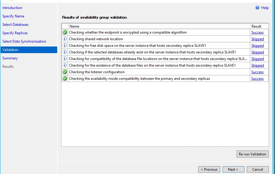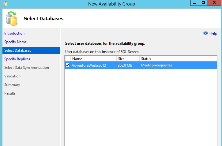 如果你不满足前面的创建可用性组的条件,比如没有完整备份过或者数据库是只读状态或者单用户模式,这里的Status会提示你。这里满足的先决条件。