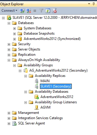 SSMS对象浏览器可以显示出我们创建好的可用性组,包括主副本和辅助副本的服务器上都能显示出来。