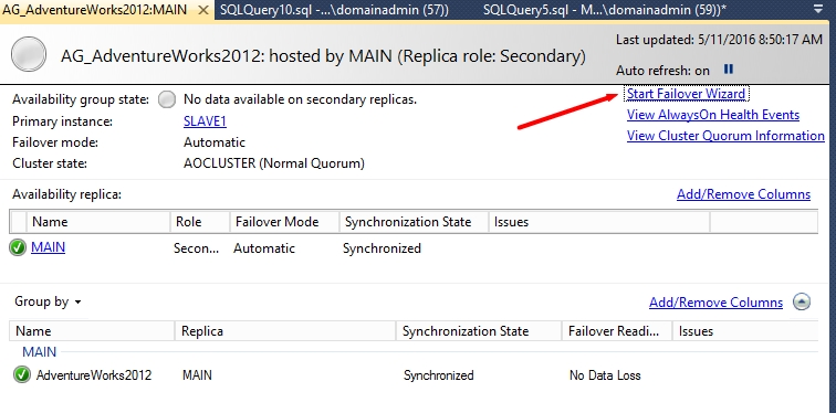 我们再把MAIN的网卡重启。这个时候ALWAYSON会先等待MAIN先重新加入CLUSTER的节点后再重新成为一个辅助副本。