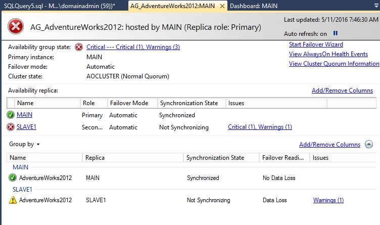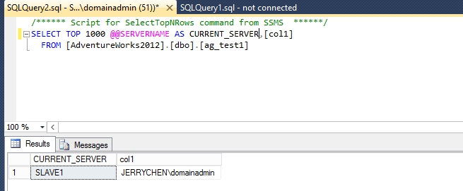 既然AlwaysOn主要的功能就是Failover。这里就测试下把SLAVE1的网卡断开后,MAIN是否会接过只读访问的活?