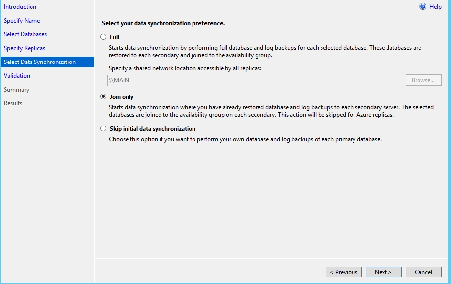 这个地方是选择初始化数据库的方式。如果你选择Full,你需要提供一个共享地址,AlwaysOn自己自动备份数据库然后还原到目标的辅助副本上。这里我们选择Join only,所以我们需要事先把数据库备份并还原到目标的辅助数据库上。