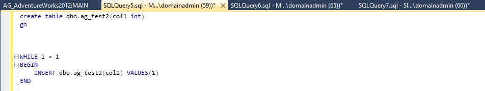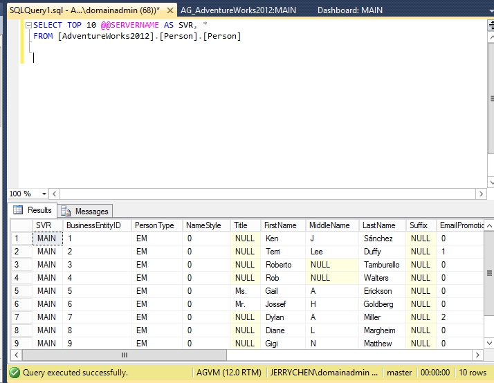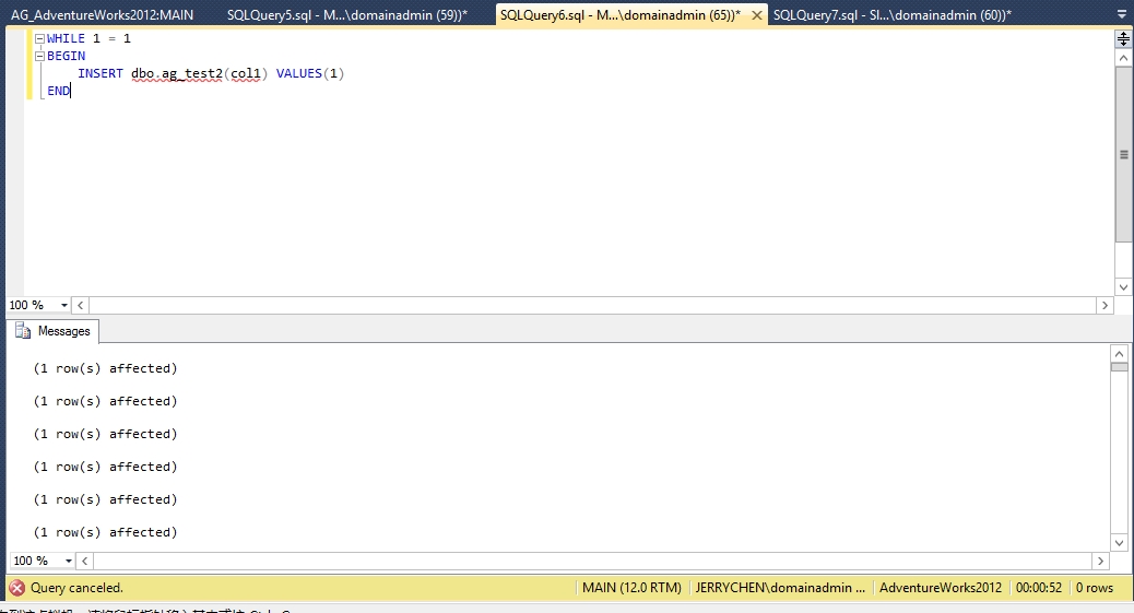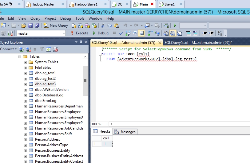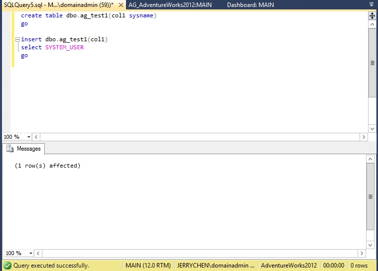 当然,我们更重要的是测试FAILOVER后,原来的辅助副本是否能接受数据写入。我们用AGVM这个虚拟服务器名开启连接后新建一张表再插入一条记录验证是否能写入数据。