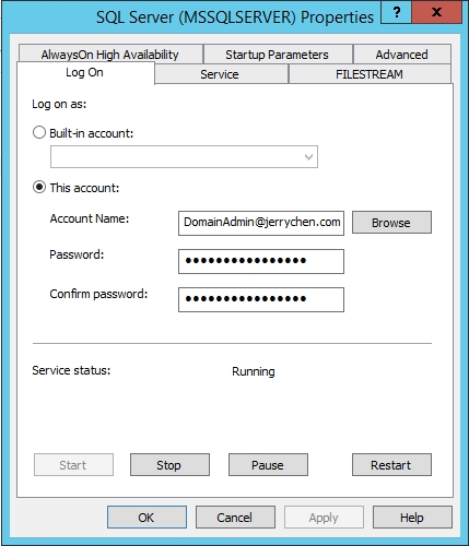 配置服务账户保证其有足够的权限操作