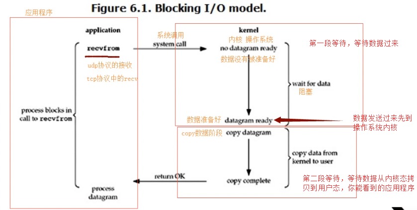 在Linux中, 默认情况下所有的socket都是blocking, 一个典型的读操作流程大概如下图:(recvfrom和tcp里面的recv在这些IO模型里面是一样的)