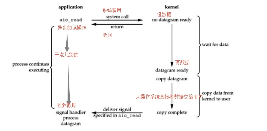 用户进程发起read操作之后,立刻就可以开始去做其它的事。而另一方面,从kernel的角度,当它受到一个asynchronous read之后,首先它会立刻返回,