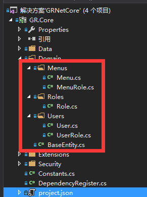 2.2 开始编写领域实体对象。这里是先实现一个简单的权限管理。所以现在GR.Core 类库中创建一个domain文件夹,然后分别创建 User,Role,Menu实体,以及一个实体基类。
