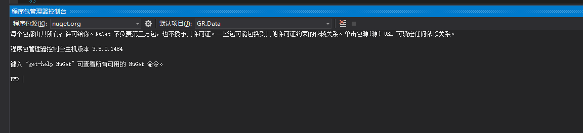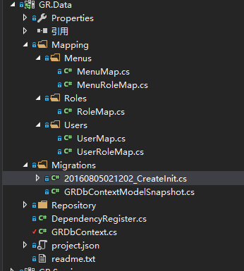 打开 nuget控制台,默认项目选择GR.Data,因为NETCORE已经取消了enable-migration,因此我们直接输入Add-Migration CreateInit 命令就可以了,然后使用update-database命令就可以生成数据库了。当你觉得Add-Migration生成的文件有问题或者不需要可以使用remove-Migration 命令删除该文件