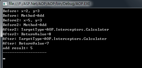 static void Main(string[] args) { var builder = new ContainerBuilder(); builder.RegisterType<Calculater>() .As<ICalculater>() .EnableInterfaceInterceptors() .InterceptedBy(typeof(CalculaterInterceptor), typeof(CalculaterInterceptor2)); // 这里定义了两个拦截器,注意它们的顺序 builder.RegisterType<CalculaterInterceptor>(); // 注册拦截器 builder.RegisterType<CalculaterInterceptor2>(); // 注册拦截器2 var ioc = builder.Build(); var calculater = ioc.Resolve<ICalculater>(); var addResult = calculater.Add(2, 3); Console.WriteLine($"add result: {addResult}"); Console.WriteLine("-------------------"); Console.ReadLine(); }