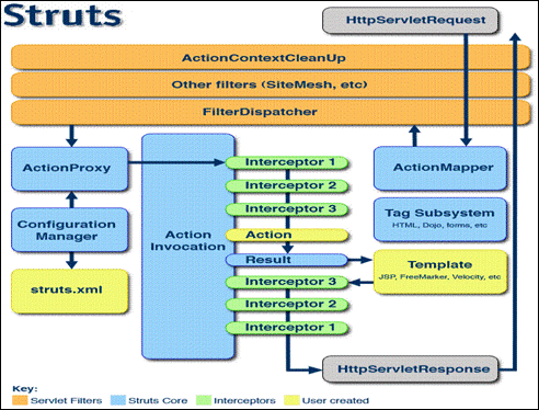 k) 根据Result对象信息,生成用户响应信息response,在生成响应过程中可以使用Struts2 框架中继承的标签,在此过程中仍会再次涉及到ActionMapper;