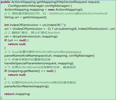 4. 通过actionMapper.getMapping()获得ActionMapping对象,Action的配置信息存储在ActionMapping对象中(Action的配置信息:Action的name、namespace和要调用的方法method)。相关代码如下图所示: