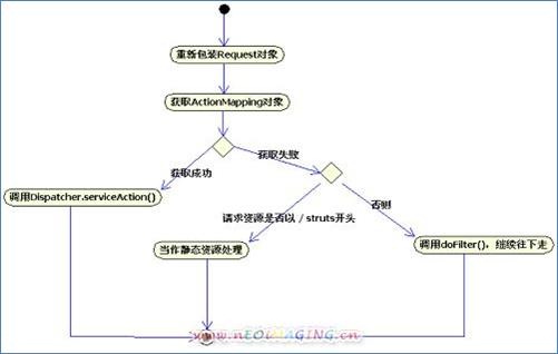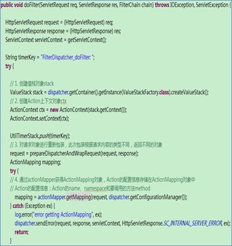 当用户向Struts2发送请求时,FilterDispatcher的doFilter()方法自动调用,doFilter()方法处理请求过程,如下: