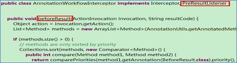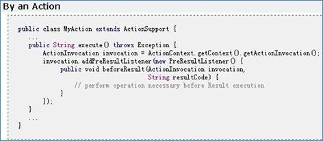 j) 如果要在返回Result之前做些什么,可以实现PreResultListener接口,PreResultListener可以在Interceptor中实现,也可以在Action中实现;