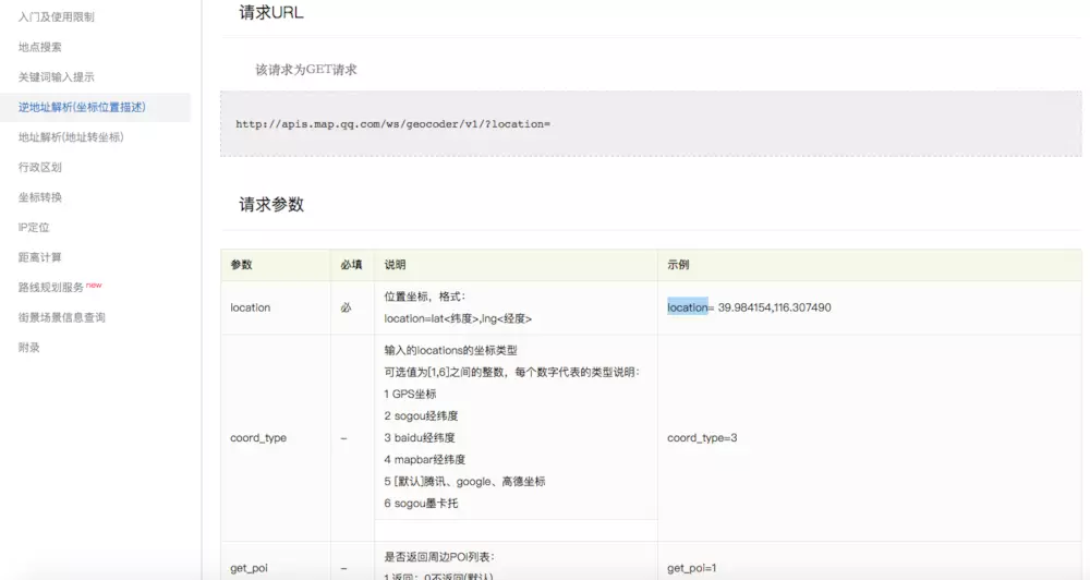进入WebServiceAPI之后大家就可以看到逆地址解析了,然后阅读一下腾讯为我们提供的开放接口,我们可以直接用GET请求获取地址的具体信息了,腾讯具体给我们的返回值大家可以注册一下进去看一看,很具体的。我直接上js代码