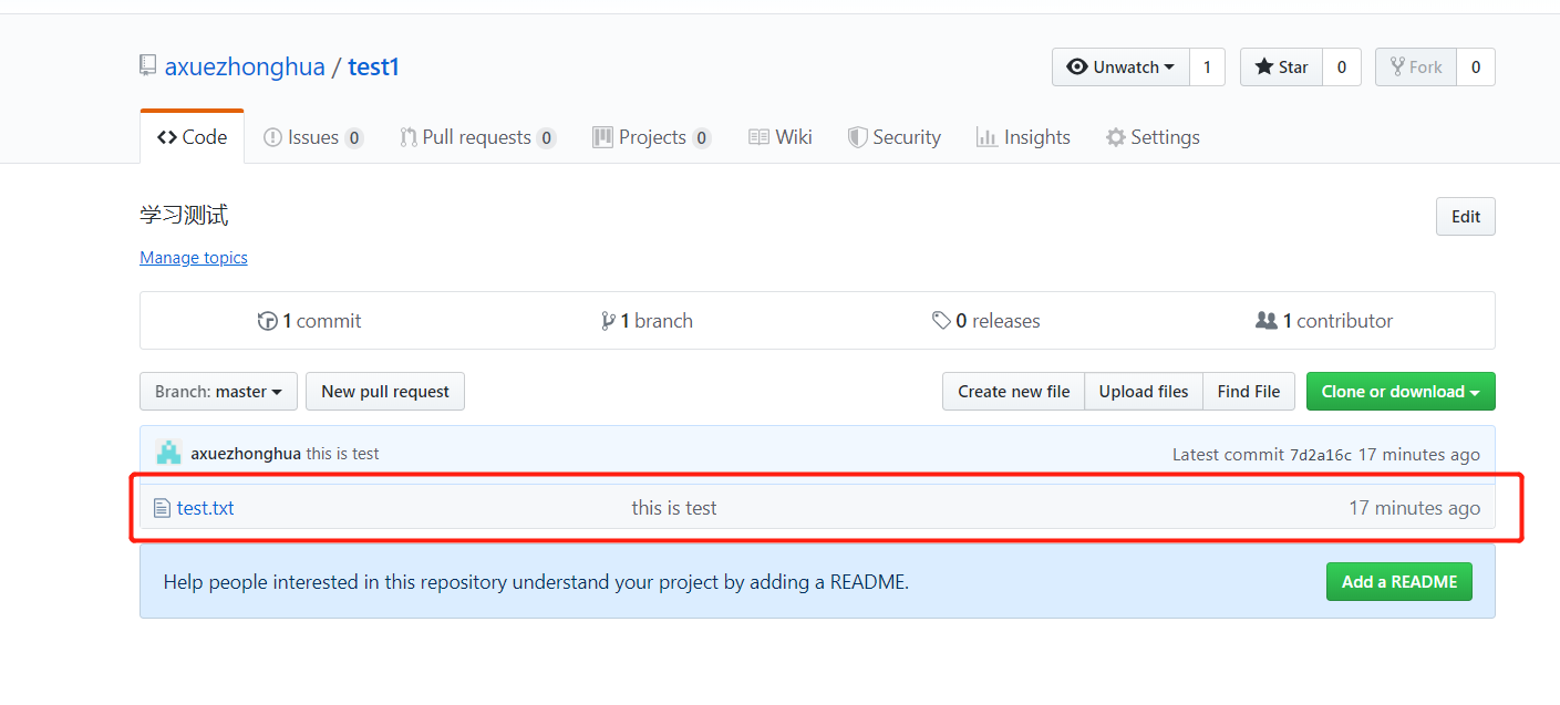 - 设置远程仓库的别名 git remote add 别名 https://github.com/axuezhonghua/test1.git