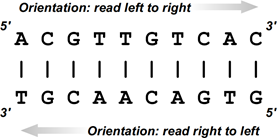 DNA链是有方向性的。核苷酸的一端叫做5’端,另一端叫做3’端。当核苷酸连接形成DNA链的时候,一个核苷酸的5’端总是和另一个核苷酸的3’端相连接。此外,当细胞使用DNA时,如转录成RNA的过程,也是从5’端到3’端一个碱基一个碱基地进行。所以,当在纸上书写DNA时,方向是从左到右的,这和DNA碱基的5’端到3’端的方向是对应的。一个编码基因可能出现在两条链的任何一条上,所以当查找或分析DNA时一定要对两条链进行分析。