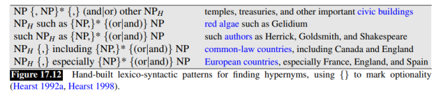 两个实体之间的especially和such as可以看做这种关系的特征。观察更多表达这种关系的句子,我们就可以构造如下的规则模板,来抽取构成上下位关系的实体,从而发现新的三元组。