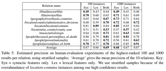 测试的指标采用查准率,方法采用了留出法(自动评估)和人工评估两种方法。留出法的做法是,把Freebase中的180万实体对的一半作为测试集(另一半用于训练)。新发现的N个实体对中,如果有n个实体对在Freebase的测试集中,那么查准率为n/N。人工评估则采用多数投票的方法。