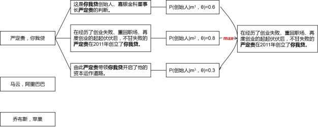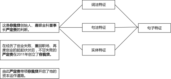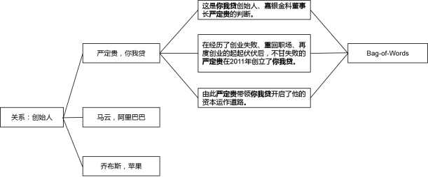 第一步:在一个大型的语料集中去找包含某一实体对(3个中的任意1个)的句子,全部挑出来。比如:严定贵于2011年创立了你我贷;严定贵是你我贷的创始人;在严定贵董事长的带领下,嘉银金科赴美上市成功。