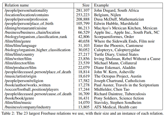 论文中把Freebase的数据进行了处理,筛选出了94万个实体、102种关系和180万实体对。下面是实体对数量最多的23种关系。