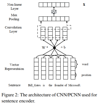 句子编码器就是上一篇论文中的PCNN或CNN网络结构,由卷积神经网络的输入层、卷积层、池化层、非线性映射层(或者说激活函数)构成。