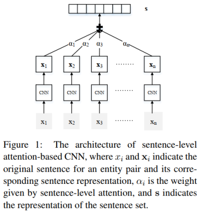 这篇论文要解决的问题,就是多实例学习会遗漏大量信息的问题。所以这篇论文用句子级别的注意力机制代替多实例学习,对于包含某实体对的所有句子,给每一个句子计算一个注意力得分,动态地降低标注错误的样本的得分,再进行加权求和,从而充分利用所有句子的信息。