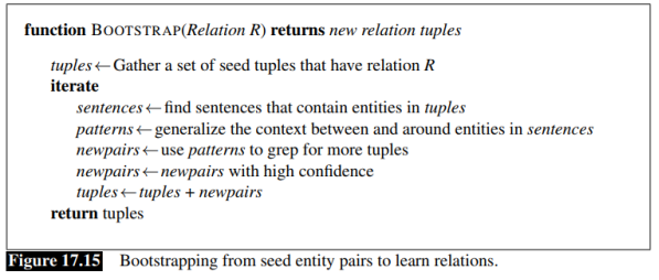 Bootstrapping算法的输入是拥有某种关系的少量实体对,作为种子,输出是更多拥有这种关系的实体对。敲黑板!不是找到更多的关系,而是发现拥有某种关系的更多新实体对。