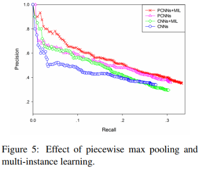 可以看到,分段最大池化比普通的最大池化效果更好,表明分段最大池化可以抽取更丰富的结构特征。把多实例学习加入到卷积网络中,效果也有一定的提升,表明多实例学习可以缓解样本标注错误的问题。