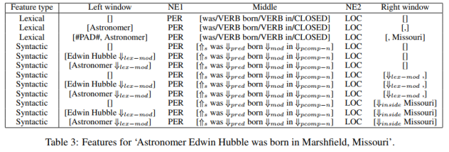 论文中使用了三种特征:词法特征(Lexical features)、句法特征(Syntactic features)和实体标签特征(Named entity tag features)。