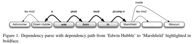 论文中的句法特征就是对句子进行依存句法分析(分析词汇间的依存关系,如并列、从属、递进等),得到一条依存句法路径,再把依存句法路径中的各成分作为向量,拼接起来。