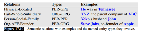 首先做命名实体识别,识别出He(PER)和Tennessee(GPE)两个实体,然后找出两个实体之间的关系为:Physical-Located,最后可以把抽取出来的关系表示为三元组的形式:(HePER, Physical-Located, TennesseeGPE),或者Physical-Located(HePER, TennesseeGPE)。