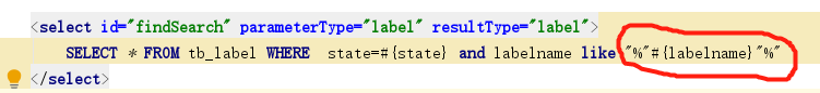 下面是一个坑,自己以身试坑,红色部分不能使用单引号括起来,这部分还有一种写法就是%${labelname}%,下面的这种是利用"%"'labelname'"%"这种sql的数据库查询语句