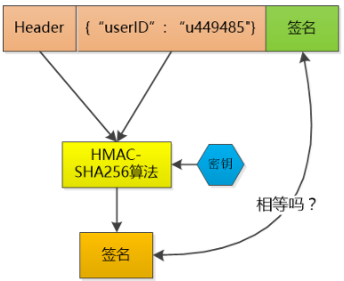 这个token 我不保存, 当小F把这个token 给我发过来的时候,我再用同样的HMAC-SHA256 算法和同样的密钥,对数据再计算一次签名, 和token 中的签名做个比较, 如果相同, 我就知道小F已经登录过了,并且可以直接取到小F的user id , 如果不相同, 数据部分肯定被人篡改过, 我就告诉发送者: 对不起,没有认证。