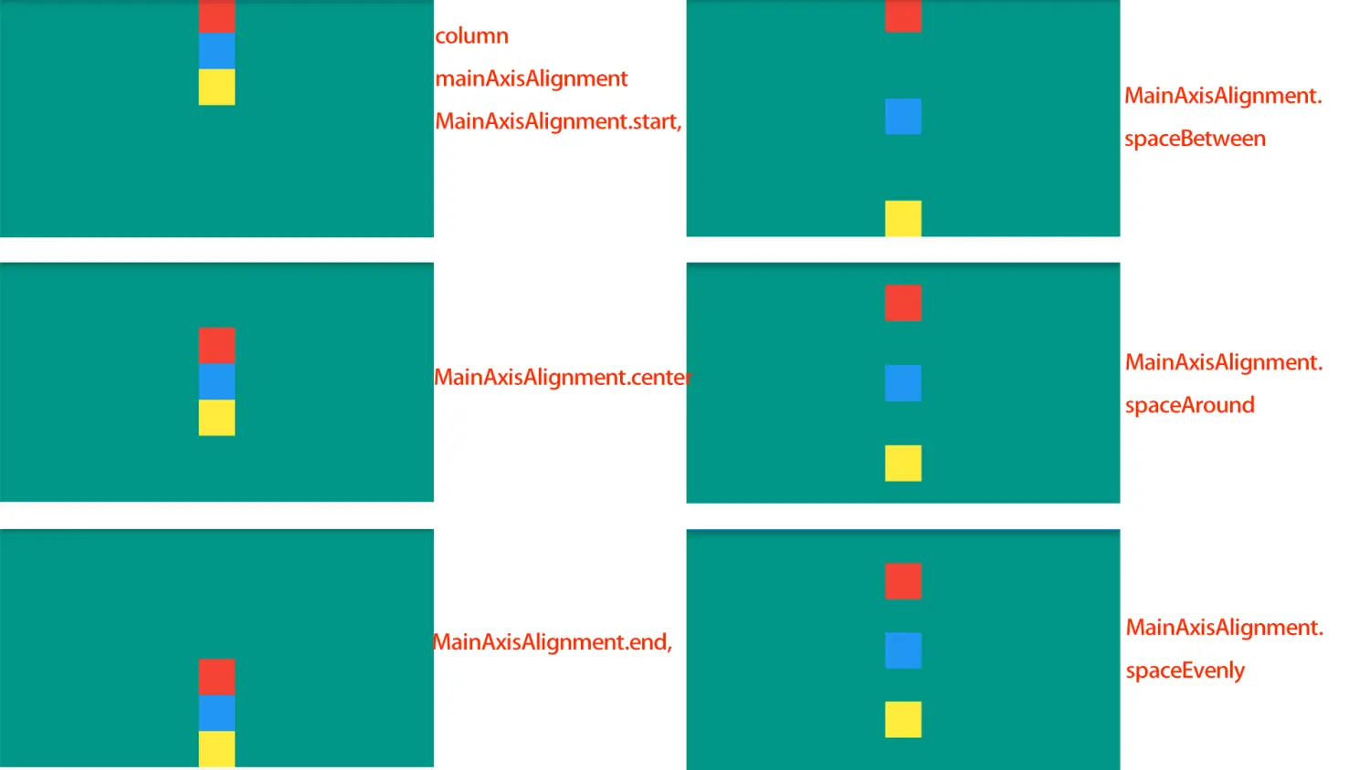 mainAxisAlignment: MainAxisAlignment.spaceEvenly, mainAxisSize: MainAxisSize.max, crossAxisAlignment: CrossAxisAlignment.center, verticalDirection: VerticalDirection.down, // textDirection:, textBaseline: TextBaseline.alphabetic, children: <Widget>[ Container( color: Colors.red, height: 30, width: 30, ), Container( color: Colors.blue, height: 30, width: 30, ), Container( color: Colors.yellow, height: 30, width: 30, ), ], ), ),
