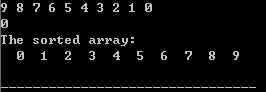 #include <stdio.h> int main() { void sort(int array[],int n); int i,slist[10]; for (i = 0; i<10 ;i++) { scanf("%d",&slist[i]); } sort(slist,10); printf("The sorted array:\n"); for(i= 0;i <10;i++) { printf("%3d",slist[i]); } printf("\n"); return (0) ; } void sort(int array[],int n) { int i,j,k,m; for(i = 0;i < n-1;i++) { k = i; for(j = i+1;j < n; j++) { if(array[j]<array[k]) { k = j; } } m = array[i]; array[i] = array[k]; array[k] = m; } }