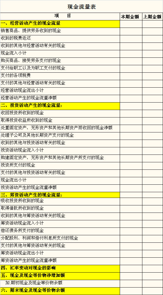 现金流量表反映企业一定期间现金的流入和流出,表明企业获得现金和现金等价物的能力.主要分为经营活动,投资活动,筹资活动产生的现金流量的三个部分
