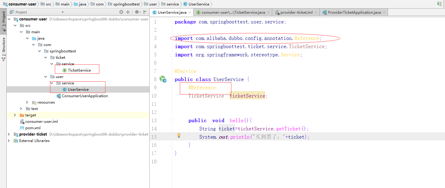 (2)引入发布者的service接口 (3)编写消费者service (4)测试类调用 (5)打印结果:买到票了:<厉害了,我的国>