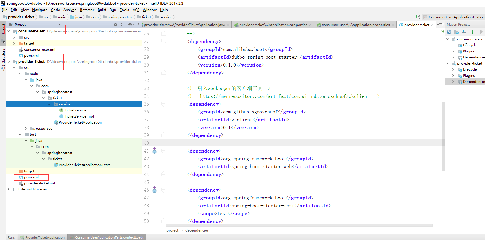 - 编写消费者: (1)引入pom文件,同上 ;编写Application配置文件