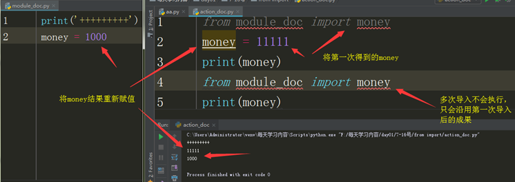 当一个模块被导入第一次以后,在此导入时,就不会在执行模块文件,会沿用第一次导入的成果