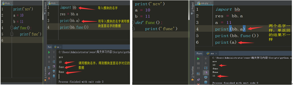 2.你如果想访问模块中的名字,必须用模块名.名字的方式