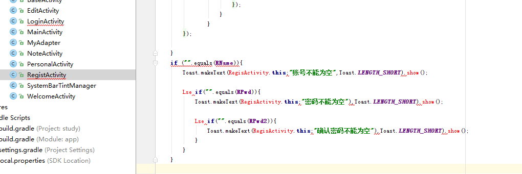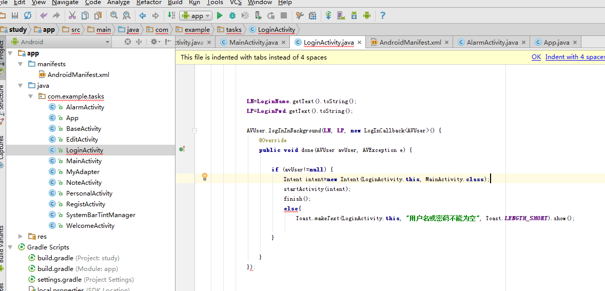 在运行登录界面,当没有输入账号密码的时候,点击登录按钮此时就出现了问题 然后寻找错误,添加else的内容。 最后程序完美的运行 转载于:https://www.cnblogs.com/zhaocen/p/6644988.html
