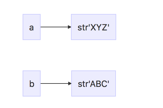 执行a = 'XYZ',解释器创建了字符串'XYZ',并把a的指向改为'XYZ',但b并没有更改: