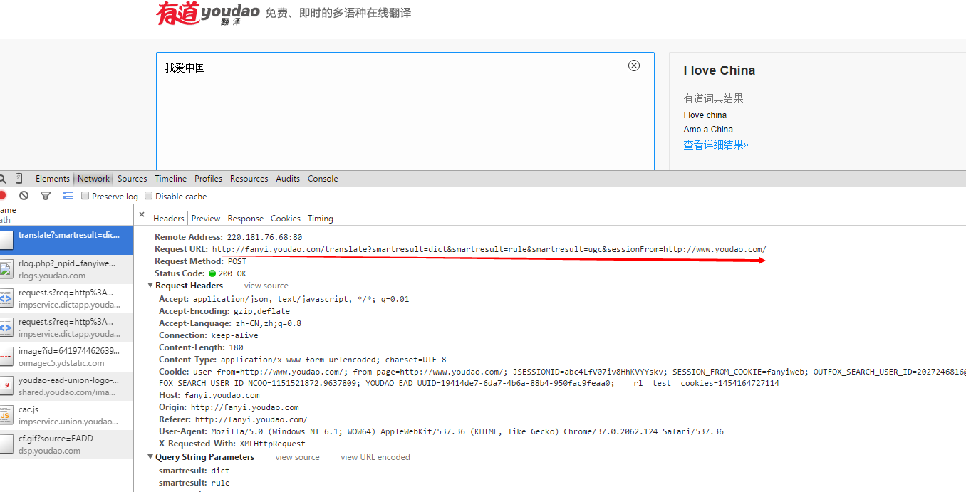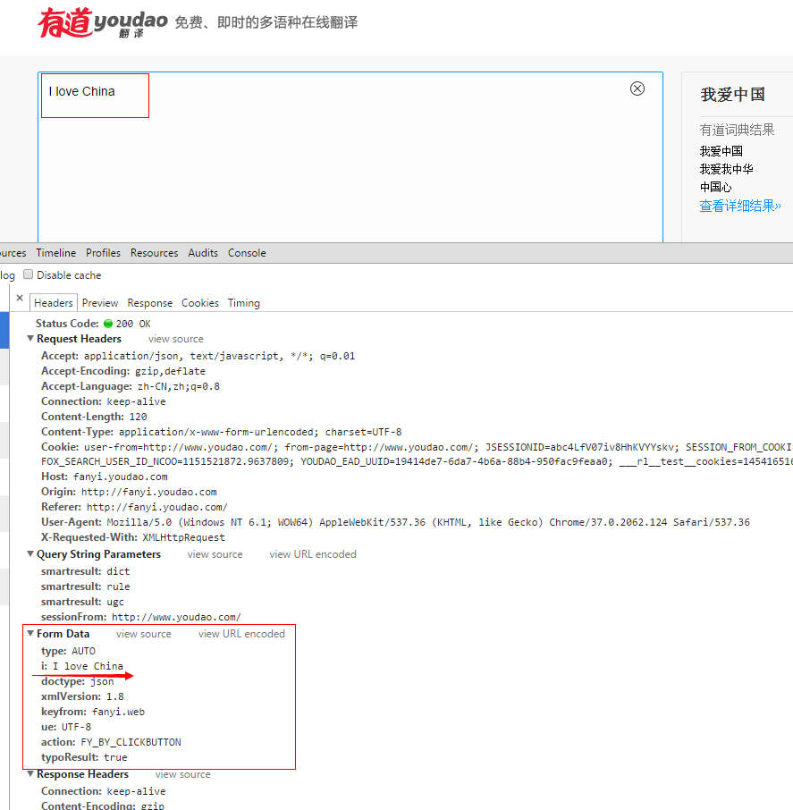 注意,上面urlopen当中的url,这个是分析有道翻译页面的真实的Request URL: