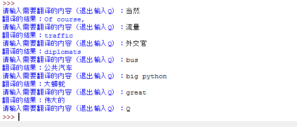 import urllib.request import urllib.parse import json while True: content = input('请输入需要翻译的内容(退出输入Q):') if content == 'Q': break else: url = 'http://fanyi.youdao.com/translate?smartresult=dict&smartresult=rule&smartresult=ugc&sessionFrom=http://www.youdao.com/' data = {} data['type'] = 'AUTO' data['i'] = content data['doctype'] = 'json' data['xmlVersion'] = '1.8' data['keyfrom'] = 'fanyi.web' data['ue'] = 'UTF-8' data['action'] = 'FY_BY_CLICKBUTTON' data['typoResult'] = 'true' data = urllib.parse.urlencode(data).encode('utf-8') response = urllib.request.urlopen(url, data) html = response.read().decode('utf-8') target = json.loads(html) print('翻译的结果:%s' % target['translateResult'][0][0]['tgt'])