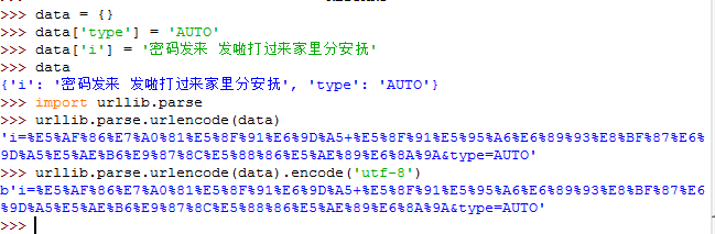 urllib.request.urlopen()其实不止一个参数,有好几个哦,其中第二个是data,data应该是一个buffer的标准应用程序/ x-www-form-urlencoded格式(python标准库原文:data should be a buffer in the standard application/x-www-form-urlencoded format)。urllib.parse.urlencode()函数接受一个映射或序列集合,并返回一个字符串的格式(python标准库原文:The urllib.parse.urlencode() function takes a mapping or sequence of 2-tuples and returns a string in this format)。我们可以看看urllib.parse.urlencode()的结果是什么样的: