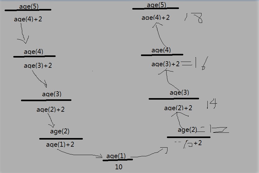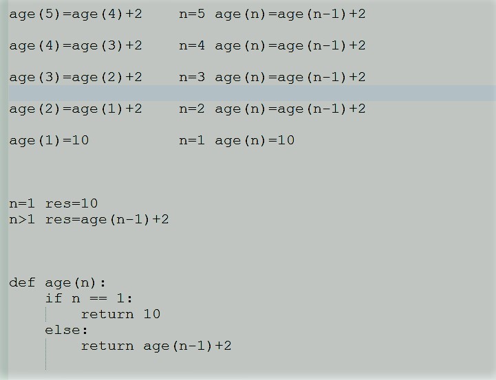def age(n): if n == 1: return 10 else: return age(n-1)+2 print(age(5)) #18
