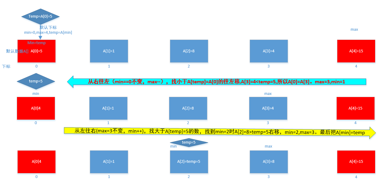 下面画一个详细的大图,只画了第一趟排序的过程,知道第一躺怎么排序,后面都是一样的。