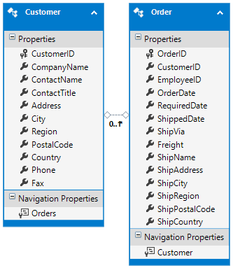 To develop this example, create a new ASP.NET MVC application based on the Empty template. Then add ADO.NET Entity Data Model for Customers and Orders tables of Northwind database. The Customer and Order entities are shown below: