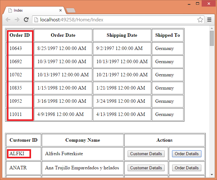 As you can see the above figure shows order details for CustomerID ALFKI above the customers table. These details are fetched via Ajax request.