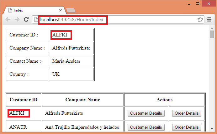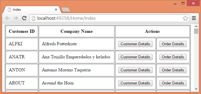 The above page consists of a table that lists customers from the Customers table of Northwind database. Each customer row has two buttons - Customer Details and Order Details. Clicking on the respective button should display customer details and order details from the database. Without Ajax you would have submitted the page back to the server and then returned a view with the corresponding details. Using Ajax you can display the details without causing any postback to the server. This is shown below: