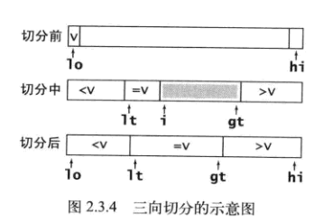 private static void sort (int [] a, int low, int high) { if(high<= low + 10) { Insertion.sort(a,low, high) return; } // Insertion表示一个插入排序类 int j = partition(a, low, high); // 调用partition进行切分 sort(a, low, j-1); // 对上一轮排序(切分)时,基准元素左边的子数组进行递归 sort(a, j+1, high); // 对上一轮排序(切分)时,基准元素右边的子数组进行递归 }
